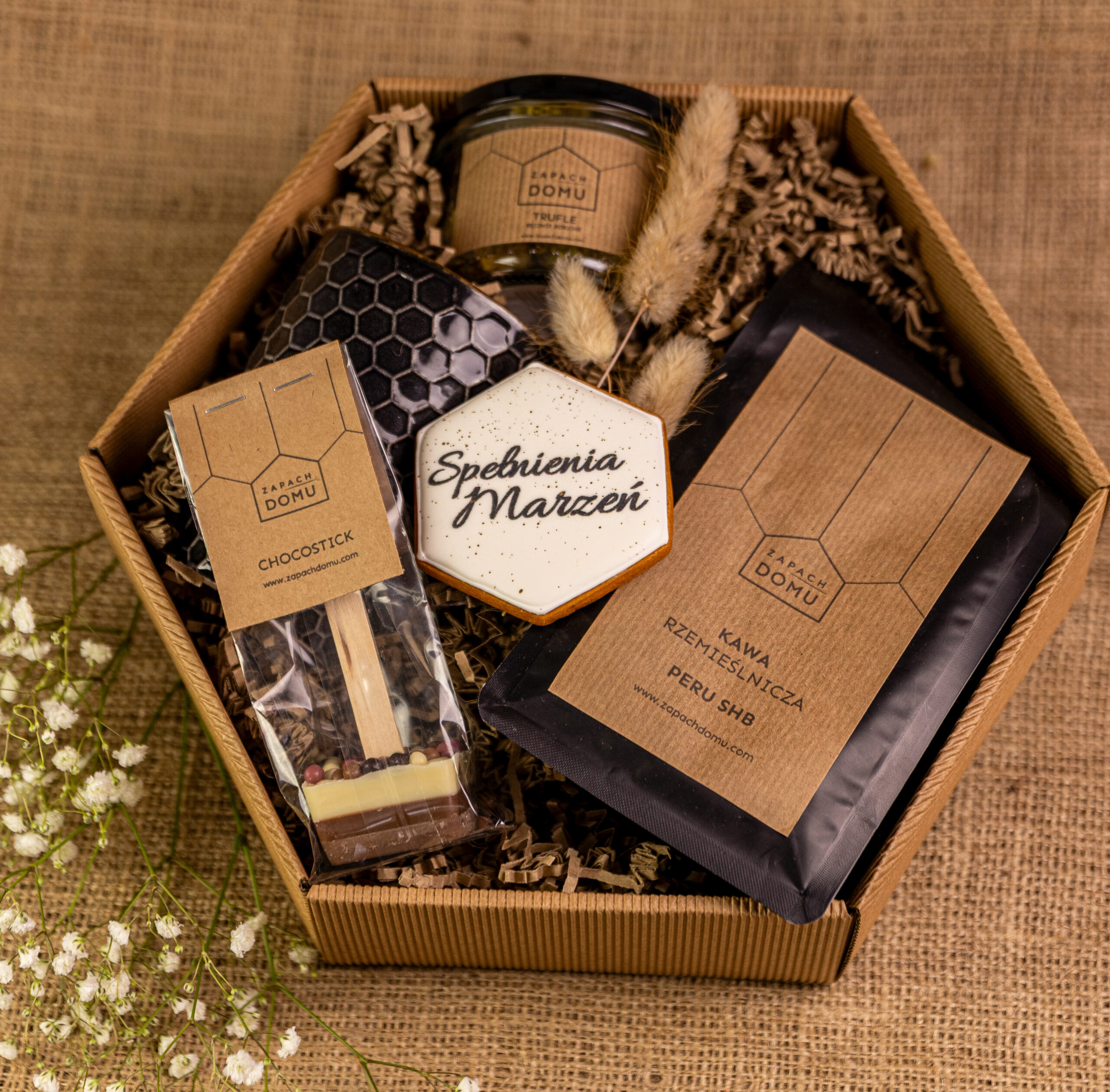Rozpocznij dzień od filiżanki aromatycznej rzemieślniczej kawy, która zachwyci swoim bogatym smakiem. Dodaj do niej aksamitne ręcznie robione trufle – słodką przyjemność, która rozpływa się w ustach. Na chłodniejsze dni chocostick z mlecznej czekolady z chrupiącymi crispearls stworzy doskonały napój o kremowej konsystencji. Całość dopełnia elegancki ceramiczny kubek, który stanie się ulubionym towarzyszem porannych i wieczornych rytuałów. A jeśli chcesz dodać jeszcze więcej słodyczy – wybierz opcję z aromatycznym piernikiem.