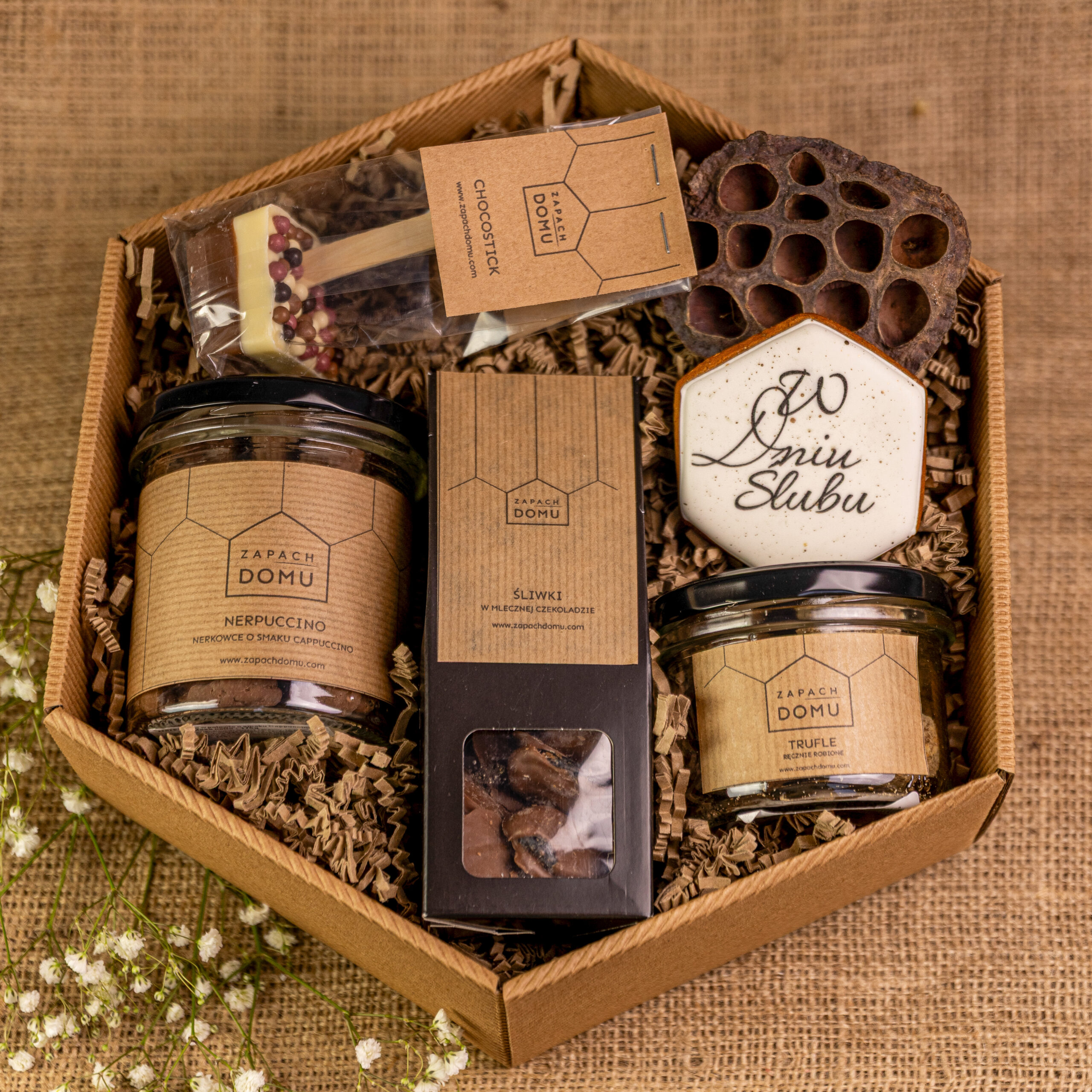 Nerkowce w czekoladzie cappuccino, śliwki w czekoladzie i ręcznie robione trufle – to zestaw dla kobiet, które uwielbiają delektować się najlepszymi smakami. Do tego chocostick, który zamieni zwykłe mleko w gęstą, kremową czekoladę. Całość wieńczy piernik z piękną dedykacją – wyjątkowy akcent dla wyjątkowej osoby.