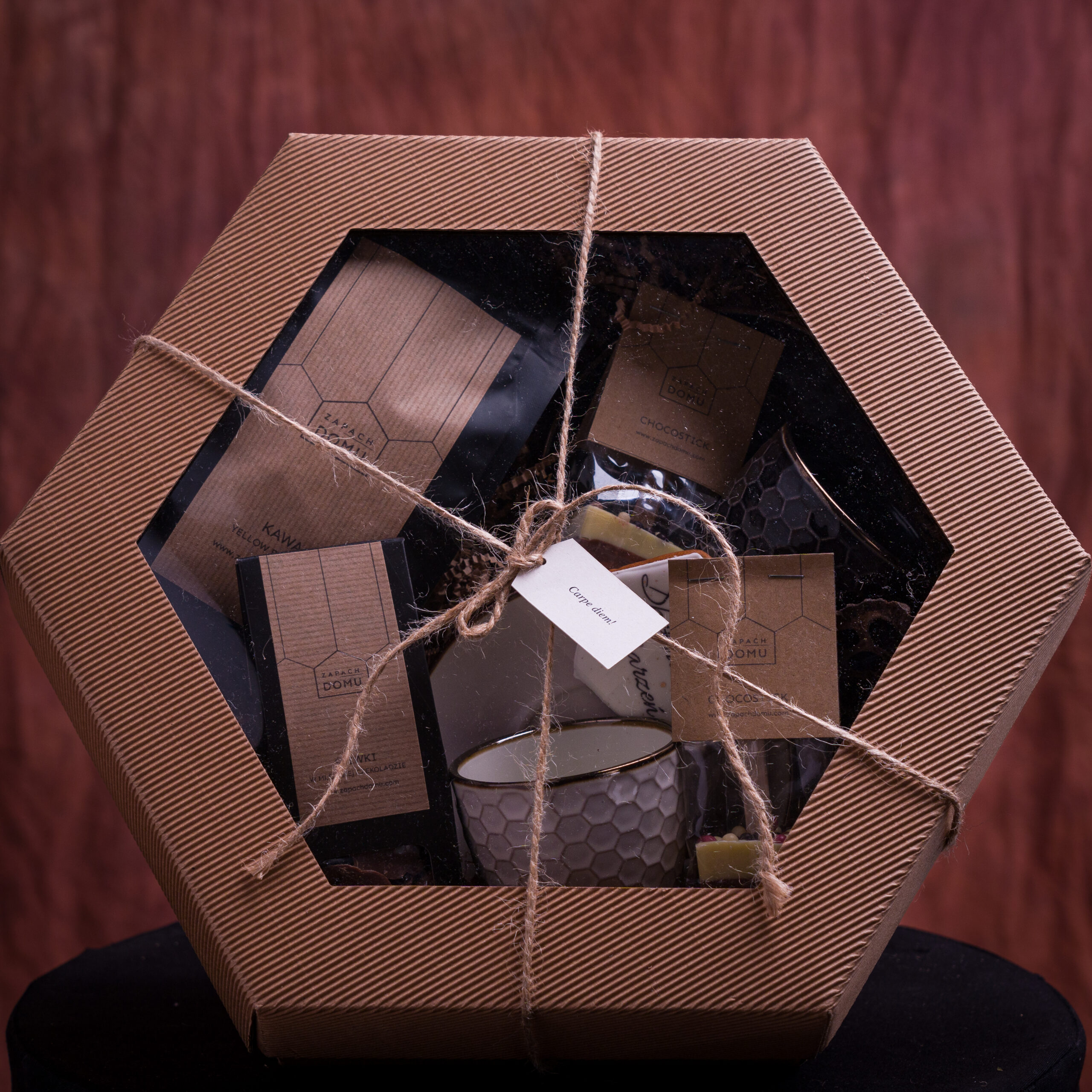 - Pudełko kartonowe przewiązane jutowym sznurkiem