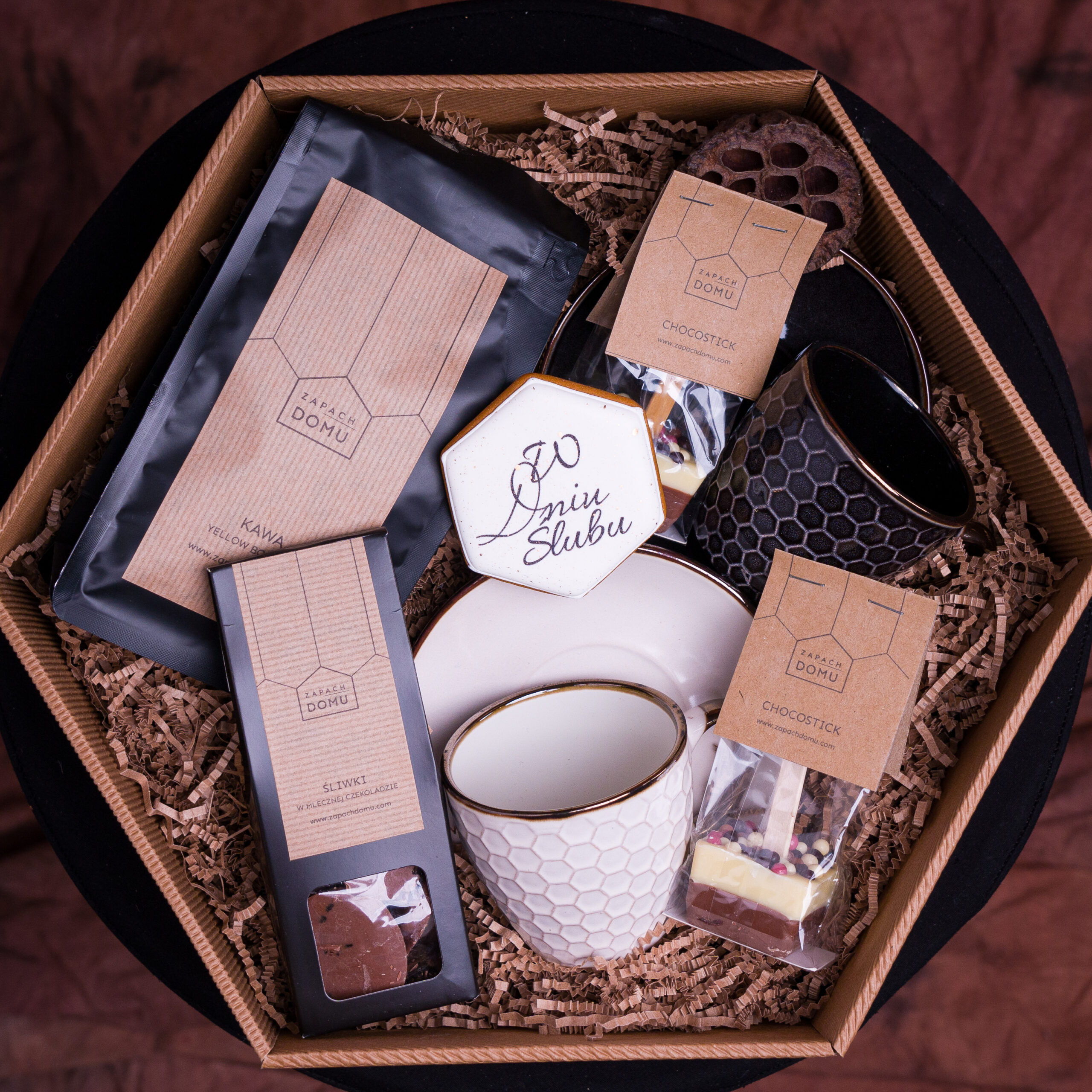Zestaw zawiera dwie ceramiczne filiżanki o pojemności 220 ml, które idealnie nadają się do wspólnej kawowej celebracji. Aromatyczna kawa rzemieślnicza z polskiej palarni oraz dwa mleczne chocosticki z chrupiącymi perełkami pozwalają na delektowanie się doskonałym smakiem. Śliwki w mlecznej czekoladzie to słodki dodatek, który doskonale uzupełnia zestaw. Całość dopełnia piernik z napisem “W Dniu Ślubu,” dodając spersonalizowany i uroczysty akcent.